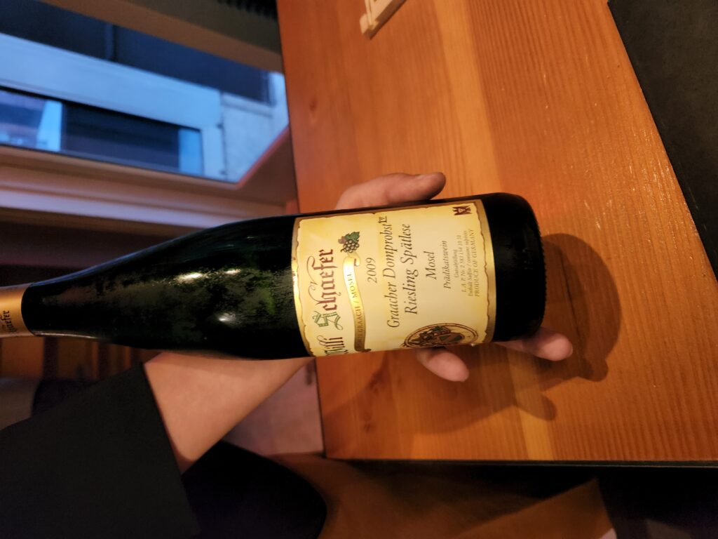 One of the joys of dining in New York is finding wines on wine list that have all but disappeared from the market. Such was the case when I opened the formidable list at Momofuko Ko, David Chang’s superlative high end restaurant tucked away in a cul-de-sac in Manhattan’s lower east side. This may be an improbable location for a great restaurant but it is somehow fitting. The back of the restaurant is devoted to an Omakase style multi course sequence of unusual and compelling dishes representing a multiplicity of food styles: A culinary representation of New York itself. The front part including the bar features a potpourri of à la carte dishes ranging from the best cold fried chicken drum sticks ever to lobster fried rice, to exquisite slices of raw scallops, etc. The food is excellent, the service outstanding and the wine list perhaps the best in New York. So, what does one drink with such eclectic food? Riesling of course! And what a list of Rieslings at Momofuko Ko. I was thrilled as were my dining companions. There were two wines from my favorite Mosel producer, Willi Schaefer. I am hardly alone in loving the Schaefer wines. The respect and affection in which they are held is richly deserved. We found the 2009 Spatlese from their Graacher Domprobst holdings on the list. I have not tasted the wine in years.