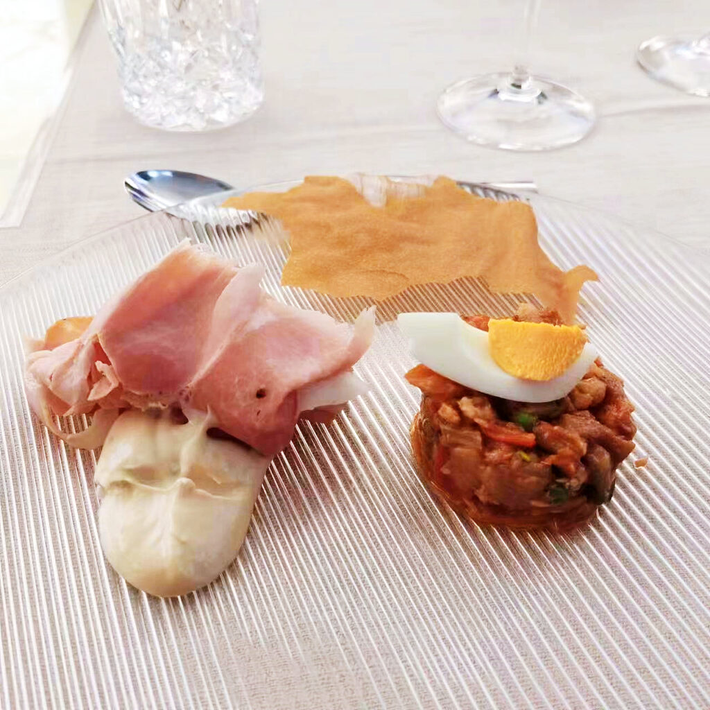 Caudacotto tonnato (Cooked ham with tuna sauce); Giardiniera (mixed vegetables in tomato sauce); Capunet (pumpkin flower stuffed with meat and vegetables)