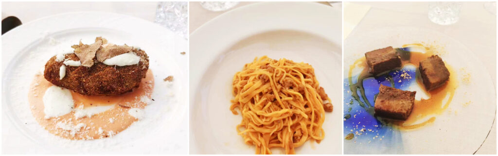 Bunet (homemade chocolate pudding with almonds and caramel), Semifreeddo al torrone (nougat parfait with chocolate sauce), panna cotta.