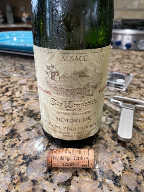 OK, I’ll be frank as well as Ian: the Clos Windsbuhl is one of my ten favourite vineyards in the world. Simply put, its limestone-rich soil delivers late harvested Riesling and especially Pinot Gris wines of unbelievable focus, precision and depth, and I simply never tire of its wines. Characterized by a generally higher altitude than other vineyards in the Zind-Humbrecht portfolio (the Clos sits at roughly 350 meters above sea level), its cold calcareous-rocky soil (or more precisely, Muschelkalk limestone sub-layer rich in seashell fossils with various clay types and chalky rock, with very thin topsoil throughout most of the site) and location near a forest all combine to make this the latest ripening site in the Zind Humbrecht portfolio of star-studded vineyard sites (that the Clos Windsbuhl is not classified as a grand cru is a problem of Alsatian wine law I won’t get into, here- but I will, soon enough). What all that means is that grapes benefit from extremely long hang time and build up levels of complexity and depth that are then invariably very evident in the wines (a great example is provided by the wines of the difficult 2006 vintage: at Zind Humbrecht, the Clos Windsbuhl wines might be the best of that year). Facing south to south-east, the Clos is also quite steep (with a gradient hovering between between 15 and 40%). Although almost always harvested relatively late in the year, the Clos Windsbuhl rarely gets hit by much Botryitis cinerea (that’s me you hear whimpering), but grapes have no trouble ripening fully. The wine is made in the most traditional of ways meant to highlight expression of terroir (as it is with all of Zind Humbrecht’s many great wines) and so extended pressing cycles, abbreviated clarification cycles (to ensure safeguarding of natural yeasts and malloproteins in the must), and extended lees contact and aging are de rigueur here. Depending on the vintage, the Clos Windsbuhl is aged usually for eighteen-twenty-four months in large old French barrels. The Zind Humbrecht 1990 Riesling Clos Windsbuhl Vendanges Tardive is a thing of beauty. Luminous golden yellow in colour, it explodes from the glass with aromas of ripe yellow peach, cinnamon-baled apples, tangerine jelly, honey, and amazing minerality. Preserved lemon peel nuances emerge on the palate, along with an array of ripe fruit and honey that is reminiscent of the aromas nicely lifted by zingy, citrussy acidity typical of its limestone terroir. At once suave and thick, this luscious but brightly acid Riesling lasts and lasts on an impressively long, nuanced finish. It is a magnificent wine and a very fine follow-up to the absolutely perfect 1989 Pinot Gris Clos Windsbuhl Vendanges Tardives, which, while I’m at it, let me just say is one of the greatest sweet wines you will ever taste. The 1990 Riesling VT is only marginally behind that beauty, but how I wish now I hadn’t drink up all my bottles of this unforgettable nectar already many many years ago. Buy whatever you can find, you’ll thank me later. Drinking window: now- 2040.